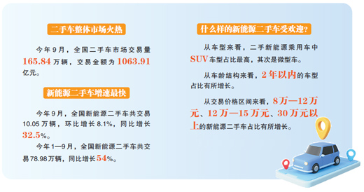 今年9月,全国新能源二手车共交易10.05万辆,环比增长8.1%,同比增长32.5%。二手新能源汽车已经成为二手车领域增速最快的细分市场。