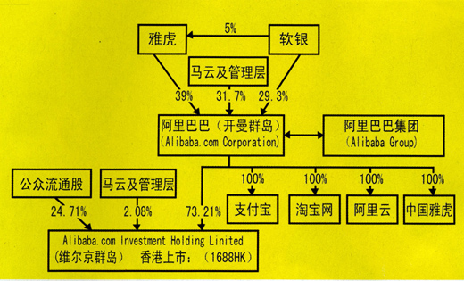 2005年8月,雅虎以10亿美元+雅虎中国,换取了阿里巴巴集团约40%的股权(当时只有35%的投票权),后稀释到约39%。这桩交易在当时震惊了全球互联网业界。人们普遍认为马云做了一笔很划算的买卖。从2010年10月开始,持股阿里巴巴集团39%经济权益的雅虎,其投票权从35%增加至39%,而马云等管理层的投票权从35.7%降为31.7%。此外,软银保持29.3%的经济权益及投票权不变。