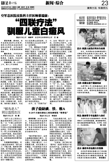 针对脾虚患儿,从健脾活血入手,补益肝肾;补充微量元素,保证色素生成有足够的“原料”;再加上适量日晒和黑光灯照射,经过一年多的临床准备,结果显示,这一“全天候”疗法对儿童白癜风治疗效果显著,且已经有了治愈的病例。