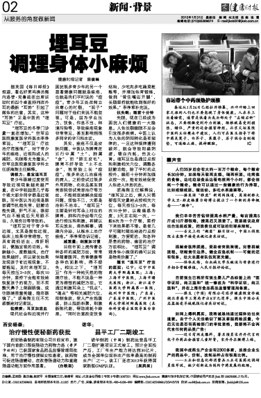 胡海翔主任解释说,“埋耳豆之后,病人只需要每天定量地点按相关穴位,每天按压2~3次,每次10分钟,以微痛感为度,3天左右贴一次,一般8次为一个疗程,坚持下来效果都不错。患者几乎可随时随处地进行点按刺激,方便简洁,和各种昂贵的药物、痛苦的治疗方法相比,“埋耳豆”调理身体小麻烦的确可以说是物美价廉了。”