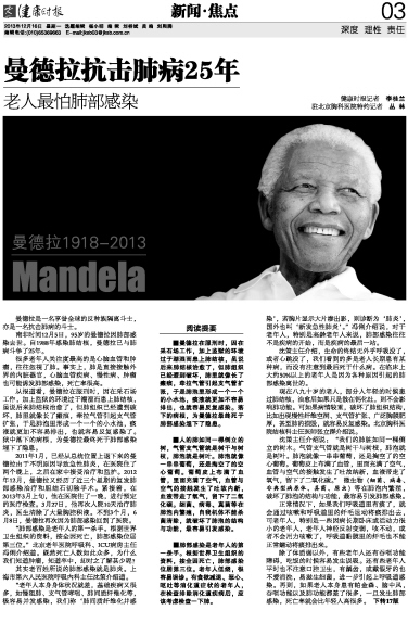 南非时间12月5日,95岁的曼德拉因肺部感染去世。自1988年感染肺结核,曼德拉已与肺病斗争了25年。