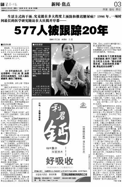 《577人被跟踪20年》 577个人,被足足跟踪了20年!1986年,一项迄今世界上时间最长的医学研究随访在大庆拉开了序幕。577个人都是处在糖尿病边缘的“糖耐量低减人群”,其中439人受到生活方式的长期干预,他们改变了大鱼大肉、松松散散的生活,管住嘴,迈开腿,其中一半以上都成功地摆脱了糖尿病。