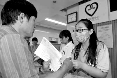 北京:预约时段精确至半小时 北京朝阳医院7月1日起预约患者分时段就诊精确至半小时。工作日早晨7:30即开诊,挂号时间提前至6:45。图为志愿者为患者进行导医服务。 牛宏超摄 |