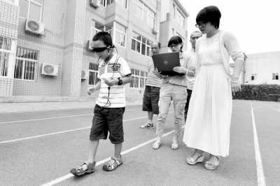 小彬彬装上电子眼 “山西男童被挖眼案”中受伤的男童小彬彬来到北京装上了电子眼。图为小彬彬在医护人员的帮助下感知路面。 牛宏超摄 |