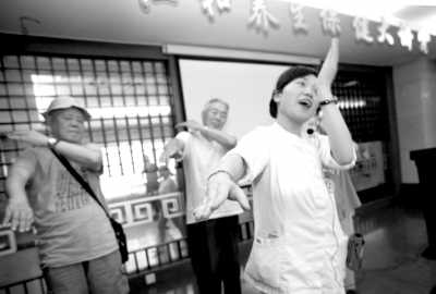 拍打阳明经帮助中风康复 浙江省中医院中西医护理专家黄双玲认为,恢复期的中风病人除常规用药外,拍打阳明经也有助于康复。图为中风病人在同医护人员齐锻炼。 于 伟摄 |
