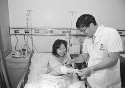 冠脉左主干已完全闭塞,致使心脏大面积缺血,出现急性心肌梗死和心功能不全,日前,命悬一线的江苏徐州患者刘女士抱着最后一丝希望来到北京安贞医院。安贞医院副院长周玉杰组成的专家团队迅速对患者进行了紧急会诊,并敲定了急诊冠脉手术方案。虽然手术过程险象环生,但患者最终转危为安,并且恢复良好。图为周玉杰为患者复查。