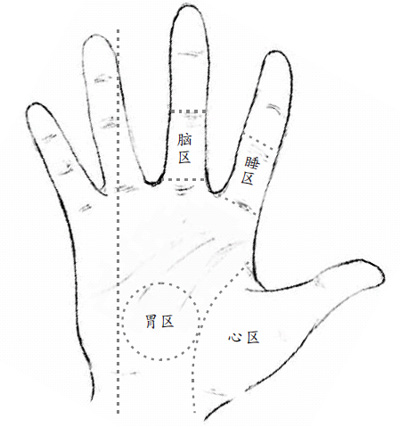 “一般我们会将手掌分为心、脑、胃、睡四部分,对于老百姓来说,最简单直观的方法就是定好各区位置后看它们的颜色变化,例如有没有白点、红点或突起。心脏的手诊部位在手掌大鱼际处,以大拇指平分线顺直沿线为界,左侧代表左心,右侧代表右心” 刘剑锋一边在记者的手上指出反射区一边细致地向记者讲解,“如果这块出现红色斑点,或有血丝但没有抱团,就说明最近心炎比较盛,容易心烦。
