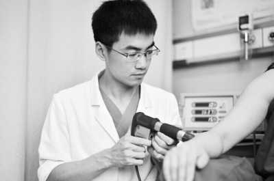 10月11日是世界镇痛日。北京大学人民医院是国家卫生计生委首批“癌痛规范化治疗示范病房”之一,在慢性疼痛的诊断和微创介入治疗方面国内领先,采用注射方法治疗各种疼痛性疾病,如颈腰椎及骨关节病、神经痛和软组织疾病;开展多种微创介入手术治疗颈腰椎疾病、病理性神经痛、癌痛、内脏痛及血管缺血性疼痛。图为该院疼痛科大夫用体外冲击波缓痛技术治疗腱鞘炎。