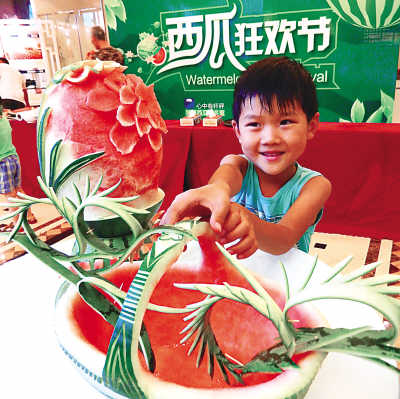 近日,河南省许昌市举办了西瓜节,西瓜雕刻、吃西瓜、比手力等比赛吸引了众多市民参与。夏天人们喜欢吃西瓜来防暑降温,还习惯把吃剩的西瓜用保鲜膜封存,然而有实验证明,盖了保鲜膜的西瓜会产生更多的细菌和微生物,食用时,最好先切去1厘米左右的暴露层。图为西瓜节上与西瓜雕刻合影的小朋友。