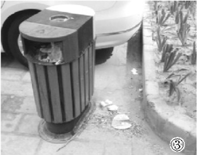 从急救坡道边到病房楼门前,从连接两栋病房楼的半封闭长廊,再到院内人员密集通行楼边四周,甚至从办公楼门前到医院餐厅入口,整齐有序地摆放着23个嵌有烟灰缸的垃圾箱(图②)。而每个烟缸里和烟缸周围,都丢弃着不少烟蒂,有的还在冒烟。心血管楼楼下一处放置烟缸的路边,几十个烟蒂和垃圾袋混杂在烟缸周围地上(图③)。