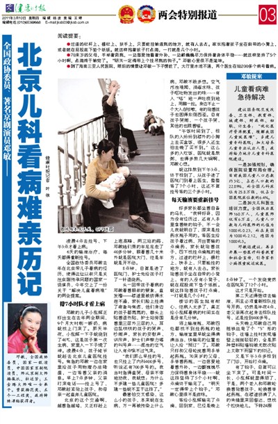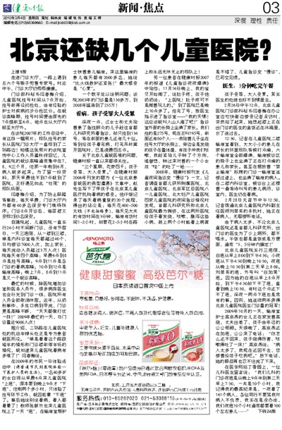 健康时报曾多次关注儿科医生资源、医疗资源紧缺问题,并先后刊发《儿科夜间急诊变慢诊》、《北京还缺几个儿童医院》、《北京儿科看病难亲历记》等重点报道,关注儿科看病难,深入还原儿科资源缺乏现状、剖析儿童看病难症结所在。