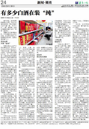 事实上,披着纯粮酿造外衣,实际为食用酒精勾兑的情况在白酒行业并不鲜见,健康时报曾在2014年1月27日刊发文章《有多少白酒在装“纯”》,揭示白酒行业标签乱象。