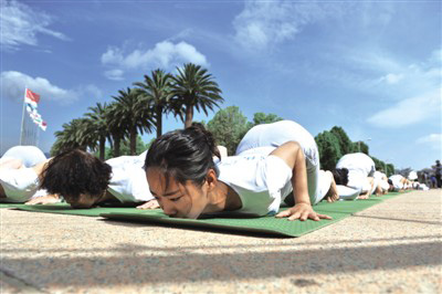 日前,瑜伽大会在昆明开幕。作为一种古老又时尚的健身方式,瑜伽已经走进了越来多人的生活。但瑜伽本身是一项专业性较强的运动,一些人只跟着视频或书籍进行学习,缺少老师的专业指导很容易适得其反,出现扭伤等意外情况。图为大会上的瑜伽爱好者们一起做练习。