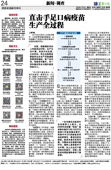 疫苗的成功研发扭转了被动局面。2015年12月,我国疫苗企业自主研发的EV71灭活疫苗通过国家食药监总局注册审批,是全球首批预防手足口病生物制品。近日,健康时报记者走进北京科兴生物制品有限公司EV71疫苗生产车间,体验了全球首例EV71型手足口病疫苗生产全过程。