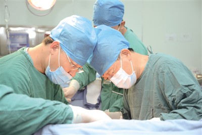 35岁的王先生日前在北京佑安医院进行了肝脏移植手术,他也成为该院开展肝脏移植技术以来的第1001位患者。北京佑安医院院长、肝移植专家李宁教授,肝胆外科臧运金主任、武聚山主任团队及手麻科池平主任团队一起协作近9小时,手术顺利完成。图为李宁教授(右)与武聚山教授(左)配合进行手术。