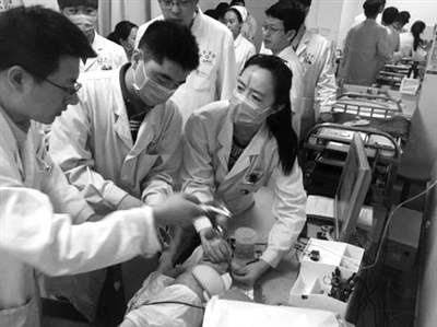 日前,在空军军医大学西京医院发生了惊险而又感人的一幕。在该院超声科门口,一位母亲怀里候诊的幼儿突然面色青紫,突发呼吸心跳暂停。腹部检查室医生赶紧做心脏超声检查,得知患儿为室间隔缺损手术后的病人。另一边闻讯赶来的心电图室、心内科医生,对病人进行开放气道操作,并立即实施心肺复苏。两分钟之后,孩子的啼哭声打破了紧张的气氛。赶到的儿科医生对患儿进行检查,初步判断患儿为痰液排出不畅引发的窒息,于是又在现场迅速组装了简易吸痰装置,立刻将卡在喉咙里的异物抽出。两分钟,把孩子从死亡线上拉了回来。