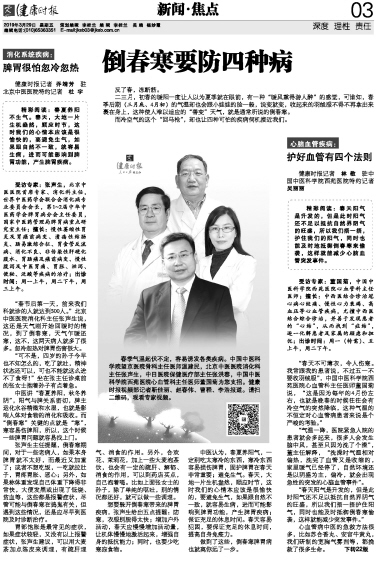 “春天不可薄衣,令人伤寒。我常跟我的患者说,不过五一不要收羽绒服”,中国中医科学院西苑医院心血管科主任医师董国菊说,“这是因为每年的4月份左右,也就是晚春的时候往往会有冷空气的突然降临,这种气温的不恒定对心血管病患者来说是个严峻的考验。”