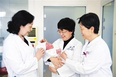 4月15日,北京大学第三医院手术室内,伴随“哇”的一声啼哭,一个新生命降生了。他的妈妈是我国大陆首例试管婴儿郑萌珠,31年前也在这里出生。院长乔杰感叹,“目前我国每100个新生儿中,就有约1~2个是借助辅助生殖技术出生的孩子。”该院生殖医学中心是目前我国收治生殖内分泌与不孕症患者规模最大的中心之一。图为院长乔杰(中)、产科主任赵扬玉(右)、生殖医学中心原常务副主任刘平(左)看望小婴儿。