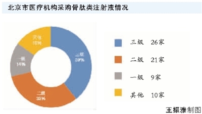 健康时报记者通过北京市药品阳光采购平台查询发现,北京地区共有61家医院使用骨肽类注射液,其中一级、二级医院或社区卫生服务中心等基层医院占比约61%。