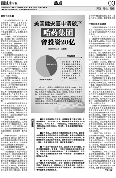 ■业内资深人士解奕炯向健康时报记者分析说,健安喜与哈药集团彼此所处的市场地位不均等,美国与中国保健品市场环境也大不相同。哈药集团看中的是健安喜的品牌,希望借着它的品牌开拓中国市场,最终除了2018年健安喜业绩上涨外,连续亏损无力扭转,健安喜最终破产。