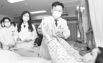 近日,接受CAR-T细胞疗法已两年的视神经脊髓炎患者黄女士来武汉同济医院复查,各项指标正常。该院王伟教授(左三)介绍,该疗法可长期缓解视神经脊髓炎。 |
