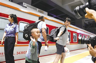 受近期暴雨影响,终点站为北京的K396次、Z180次、K1178次列车因线路封闭停留在北京门头沟区域。8月3日深夜2时10分,最后一批滞留旅客顺利通过铁路转运至北京丰台站。为顺利完成最后一批滞留旅客的转运任务,北京丰台站组织了约100人的队伍,帮助旅客拿行李,指引旅客出站,并为行动不便的旅客准备了轮椅和担架。图为到站乘客。
