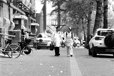 4月15日上午,北京市朝阳区六里屯社区卫生服务中心家庭病床负责人万涛背起出诊箱,行走在曲折的小巷和高高矮矮的楼栋中,为家庭病床患者入户服务。