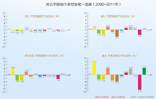 由于对地下水多年的掠夺性开采,华北平原已经成为世界上最大的地下水“漏斗区”。2011年中国地质科学院水文地质环境研究所发布的一项数据表明,包括浅层漏斗和深层漏斗在内的华北平原复合地下水漏斗,面积为73288平方公里,占华北平原总面积的52.6%。其中,河北境内形成的7个深层地下水漏斗区,总面积就达4.4万多平方公里。