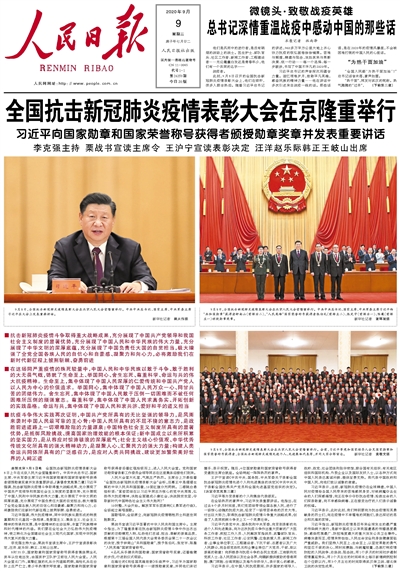 本报北京9月8日电 全国抗击新冠肺炎疫情表彰大会8日上午在北京人民大会堂隆重举行。中共中央总书记、国家主席、中央军委主席习近平向国家勋章和国家荣誉称号获得者颁授勋章奖章并发表重要讲话。(讲话全文见第二版)习近平强调,抗击新冠肺炎疫情斗争取得重大战略成果,充分展现了中国共产党领导和我国社会主义制度的显著优势,充分展现了中国人民和中华民族的伟大力量,充分展现了中华文明的深厚底蕴,充分展现了中国负责任大国的自觉担当,极大增强了全党全国各族人民的自信心和自豪感、凝聚力和向心力,必将激励我们在新时代新征程上披荆斩棘、奋勇前进。