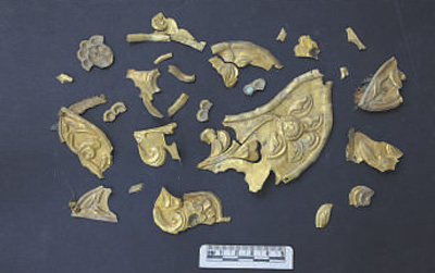 光泽来自一件方形龙凤狮纹银饰金王冠。王冠前后饰一对翼龙,两侧饰一立凤,后侧护颈饰双狮,周身镶嵌各色宝石,内衬丝绸,王冠的前檐缀以珍珠冕旒。这一不见于以往的考古发现让人喜出望外。然而,金属片已明显矿化,镶嵌的宝石粉化、脱落,纺织品几乎糟朽殆尽,王冠亟待保护修复。这顶金冠的胎体厚度不到200微米,几乎与3张A4纸叠加的厚度相当。更为棘手的是,金银质胎体普遍出现了分层腐蚀,下半部分已经严重粉化,轻轻一触便会崩散。