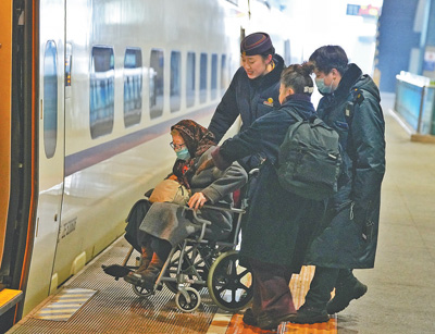 2月8日,新疆乌鲁木齐站,列车长与同事帮助旅客乘坐D8812次列车。