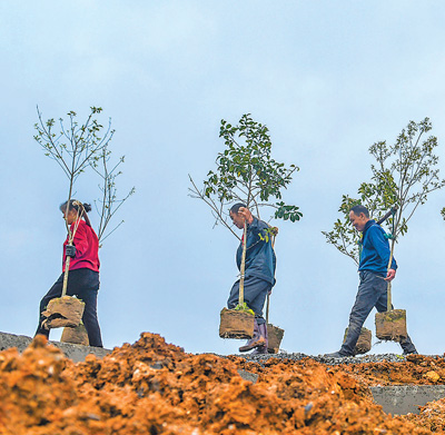 3月12日,湖南省永州市道县上关街道虎子岩社区,群众在挑运树苗,开展义务植树。当天是我国第四十七个植树节。