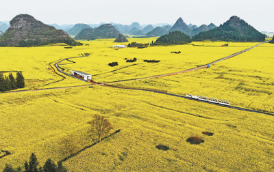 近日,云南罗平县油菜花竞相绽放,游客乘小火车在罗平县金鸡村的花海中游玩。当地政府打造“油菜花+”多元旅游模式,培育赏花、吃花、花海赛事等多种业态,促进农文体旅融合发展,助力群众增收致富。自2月进入油菜花期以来,罗平县累计接待游客170万人次。