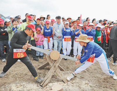 施秉县城关镇上翁哨村村民在参加花田锯木接力赛。