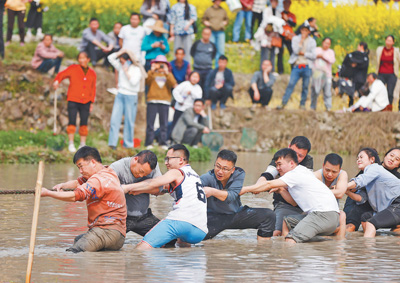近日,贵州省施秉县多地举办了别开生面的“田运会”,田间拔河、扁担挑粮、锯木接力赛等趣味活动精彩纷呈,游客和村民参加各项活动,欢声笑语不断,尽享春日时光。