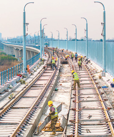 江苏南京江宁区,宁马城际铁路建设现场,工人正在铺设钢轨。