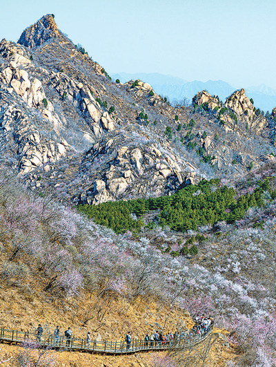 近日,在北京市昌平区,山桃花迎春绽放,吸引不少游人前来踏春赏花。