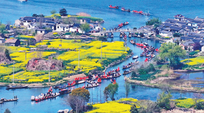 4月6日,2025泰州姜堰溱潼会船节在江苏泰州溱湖国家湿地公园举行。500多条船只和上万名选手飞篙走桨,弄潮击浪。溱潼会船是国家级非物质文化遗产代表性项目,是一种独具特色的水上民俗活动。图为会船节活动现场。