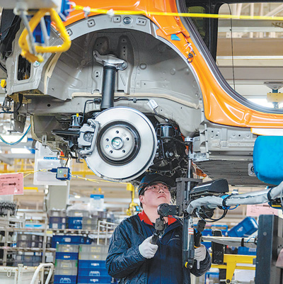 浙江湖州长兴,工人在数字化生产线上赶制新能源汽车。