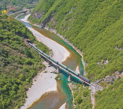 4月16日,甘肃省陇南市两当县,6063/4次公益慢火车穿行在宝成铁路。这趟公益慢火车站站停靠,以惠民票价服务民生。