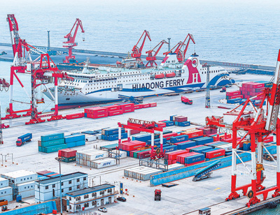 山东荣成市石岛管理区石岛新港口岸,满载货物的“华东明珠8”轮有序进行装卸作业。