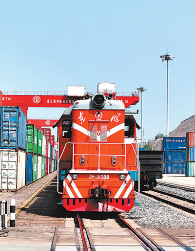 江苏中哈(连云港)物流合作基地,一列满载集装箱的中欧班列准备发车。