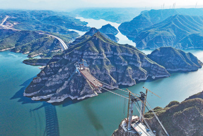 济新黄河大桥是河南省济(源)新(安)高速公路的控制性工程。大桥横跨黄河小浪底库区,主跨长度555米,是世界首座独塔单跨地锚式回转缆悬索桥。目前,大桥主缆架设已全面完工,钢桁梁架设进度过半,预计6月份完成全桥钢梁合龙,年底实现通车。