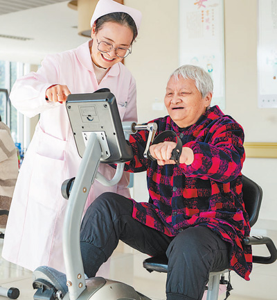 江苏南通市通州区南山颐养中心,护理人员在帮助老年人进行康复训练。