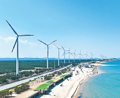 山东荣成市成山镇北部沿海风电场,风电机组在生产绿色能源。