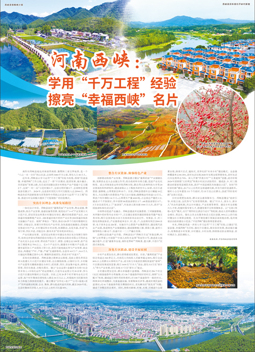 近年来,西峡县以学习运用“千万工程”经验为统揽,围绕“民富县强、幸福西峡”工作主线,走出了一条“片区联动、组团发展、城乡融合、共同富裕”发展之路,先后成功创建全国乡村特色产业产值超十亿元镇2个、全国“一村一品”示范村镇5个、全国文明村镇5个、全国特色景观旅游名镇2个。2024年,全县农村居民人均可支配收入达25944元。西峡县的系列创新探索为同等条件中西部山区县学习运用“千万工程”经验、推进乡村全面振兴提供了可复制推广的经验模式。