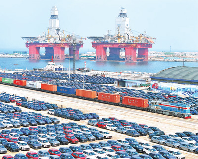 5月7日,一列装载着过境中转集装箱的列车从山东港口烟台港发车。今年以来,该港打通“日本—烟台—蒙古国”“日韩—烟台—俄罗斯”等海铁联运过境通道。