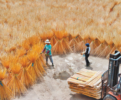 近年来,江西吉安泰和县利用当地毛竹资源丰富的优势,积极发展毛竹加工产业,提升产品附加值,带动农民增收。图为5月10日,泰和县桥头镇石壁村,加工厂员工在晾晒竹条。