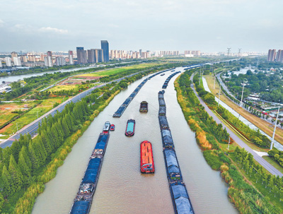 江苏省淮安市持续推进大运河国家文化公园建设,统筹生态保护、绿色航运整治、文化传承与产业升级,全力打造总长125公里的大运河百里画廊。该工程东起淮安船闸,经里运河、京杭运河至五河口,延伸至洪泽湖大堤等水域,覆盖沿线街道乡镇。图为5月10日,货船行驶在京杭大运河淮安段。