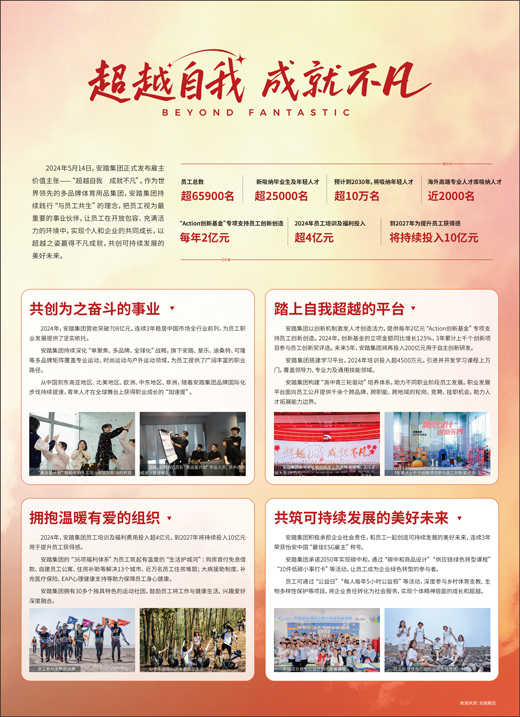 2024年5月14日,安踏集团正式发布雇主价值主张——“超越自我 成就不凡”。作为世界领先的多品牌体育用品集团,安踏集团持续践行“与员工共生”的理念,把员工视为最重要的事业伙伴,让员工在开放包容、充满活力的环境中,实现个人和企业的共同成长,以超越之姿赢得不凡成就,共创可持续发展的美好未来。